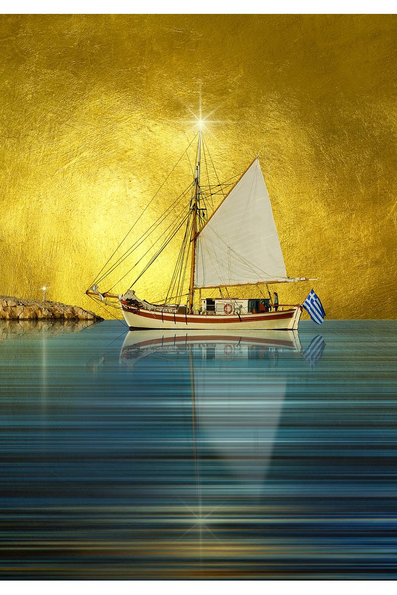 "Greek Trechandiri" The small traditional sea-going vessel used for trading or fishing, originally made of wood and powered by sail. Here at the entrance of the port of Folegandros / 36°36'51.5"N 24°57'10.9"E